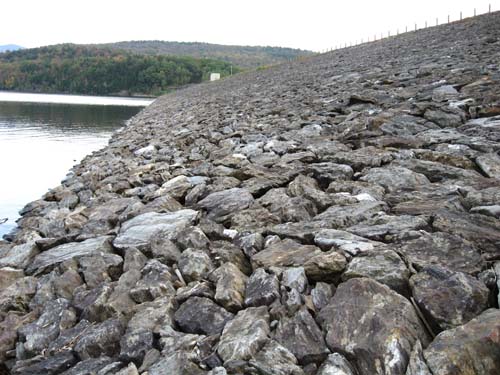 Waterbury Dam is an earthen structure faced with stone. CCC crews set the stone by hand.